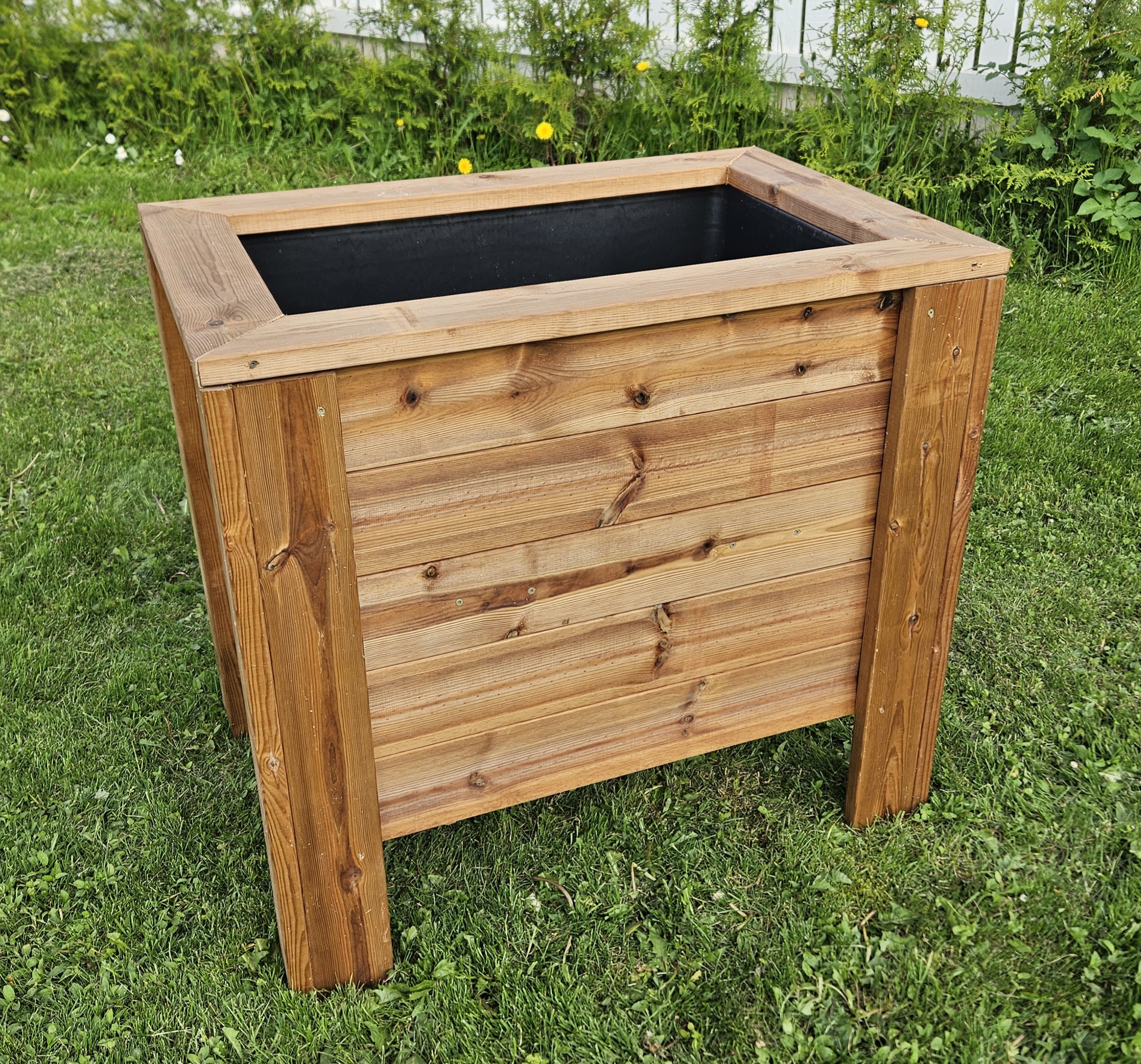Sügavimmutatud terrassilauast taime- lillekast liistudega.